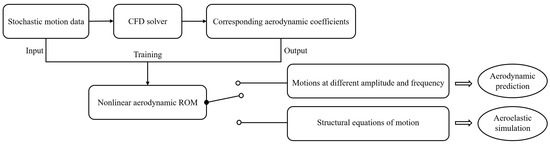 Figure 3 illustrates the flowchart for training and application procedures of the proposed reduced-order model (ROM). In this study, the ROM is trained using stochastic motion data as inputs, while the corresponding aerodynamic coefficients, obtained from computational fluid dynamics (CFD) simulations, serve as the outputs. A detailed description of the training procedure and model parameters is provided in Section 4.1. After successful training, the ROM can be applied for the following purposes: