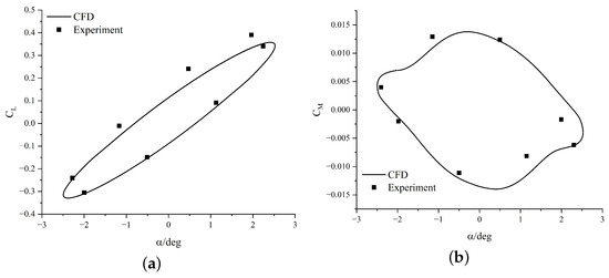 The numerically computed hysteresis loops of the lift and moment coefficients are compared with the experimental values provided by AGARD CT5 [36], as shown in Figure 5. The results indicate a good agreement between the CFD-calculated values and the experimental data, which confirms the accurate predictive capabilities of the unsteady flow solver used in this study.