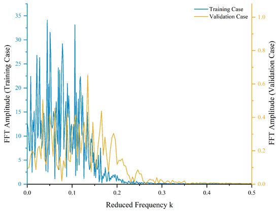 The choice of input signal significantly influences the accuracy and generalizability of the reduced-order model, necessitating a random excitation that encompasses a broad frequency spectrum and amplitude variations [18]. In this study, we employ filtered white Gaussian noise (FWGN) signals as inputs for both the training and validation datasets, as illustrated in Figure 7, where T represents discrete time steps. Specifically, the training dataset comprises 5000 time steps with relatively large amplitudes, whereas the validation dataset consists of 2000 time steps featuring smaller amplitudes. The smaller-amplitude input utilized in the validation set is intentionally chosen to rigorously assess and enhance the model’s generalization capabilities across varying input conditions. Additionally, the spectral content of these signals is examined using Fast Fourier Transform (FFT) analysis to confirm adequate frequency coverage, as presented in Figure 8.