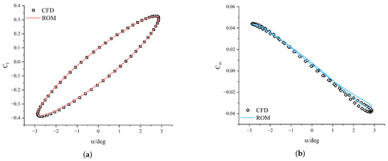 Comparison of predicted aerodynamic coefficients with CFD results for case 2. (a) Hysteresis loop of lift coefficient. (b) Hysteresis loop of moment coefficient.