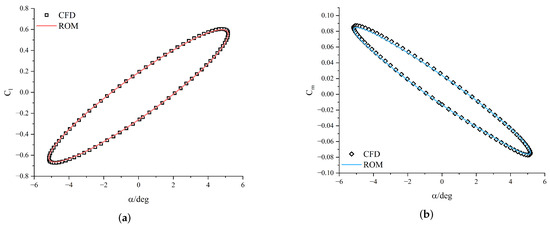 Comparison of predicted aerodynamic coefficients with CFD results for case 5. (a) Hysteresis loop of lift coefficient. (b) Hysteresis loop of moment coefficient.