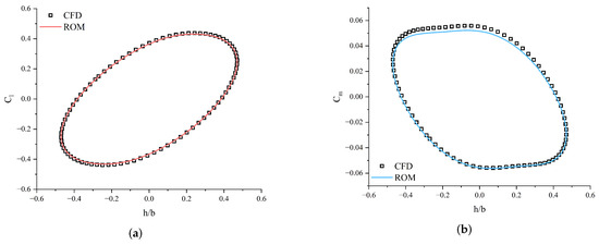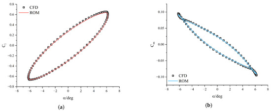 Comparison of predicted aerodynamic coefficients with CFD results for case 6. (a) Hysteresis loop of lift coefficient. (b) Hysteresis loop of moment coefficient.