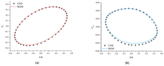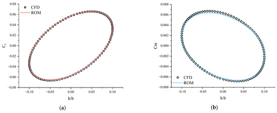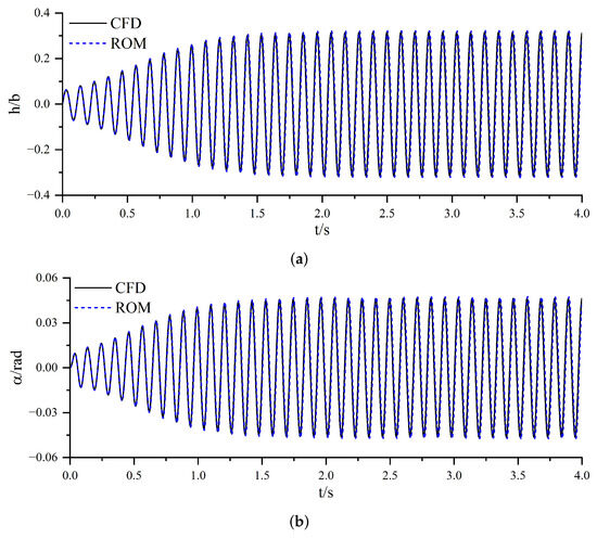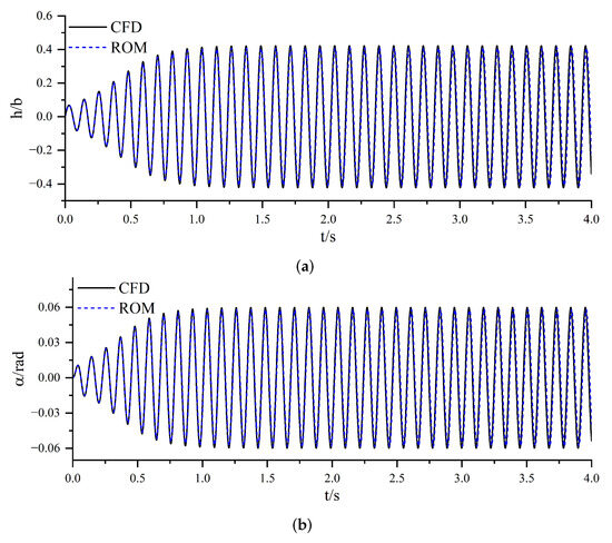 In this subsection, the nonlinear aerodynamic reduced-order model is coupled with the structural equations of motion to analyze the aeroelastic system. To rigorously assess the predictive capability and precision of the proposed ROM in forecasting limit cycle oscillations (LCO), standard benchmark parameters commonly used in aeroelastic studies [41] are adopted. Specifically, the following parameters are used: the NACA64A010 airfoil, , , , , , , and . The use of these established aeroelastic parameters ensures the ROM is tested under physically meaningful and widely recognized conditions, thus demonstrating its suitability and reliability for predicting nonlinear aeroelastic phenomena.