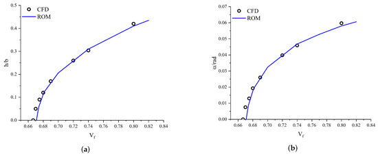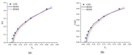 Comparison of LCO trends predicted by different ROMs with CFD results. (a) Plunging amplitude vs. . (b) Pitching amplitude vs. .