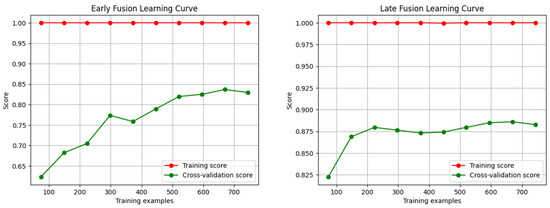 The learning curves of Early and Late Fusion models are displayed in Figure 2. Early Fusion shows an incremental learning from the beginning until 670 training samples, with a minor decline at the end, with a maximum score reached of 0.83. Late Fusion, however, shows a steep inclination until 210 samples and then a plateau with a steady score on the training data, reaching a peak score of 0.89. Even though both models exhibit balanced learning curves, Late Fusion exhibits a more advantageous curve, indicating that the data are fitting well with the model. The plateau in the graph shows that the model learned as well as it could, and further data would not improve the model’s ability.