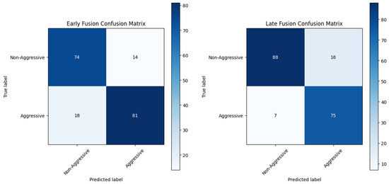 Confusion matrix comparison is being displayed in Table 3 and Figure 3, highlighting the model’s classification abilities both in positive and negative prediction class cases. Late Fusion reduced the number of false negatives, showing that it is less likely to falsely classify aggressive occurrences. This is advantageous in applications in which failing to detect aggression could have significant consequences. Early Fusion, on the other hand, maintains a slight advantage in false positives, aligning with its improved precision.