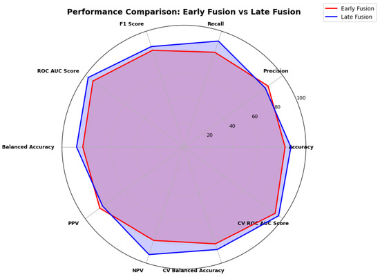 Final results of the performance metrics were drawn into a multi-axis spider diagram to better visualize strengths and weaknesses in the performance of the two models. Metrics are displayed in Figure 4, with Late Fusion outperforming Early Fusion in recall, accuracy, F1 score, ROC-AUC, Balanced Accuracy, Negative Predictive Values, Cross-Validation Balanced Accuracy, and Cross-Validation ROC-AUC score. The Cross-Validation Metrics were calculated during the outer folds inside the 5 Folds × 5 Repeats Nested CV before the application of the best hyperparameter tuning. These are a reliable metric of the model’s classification ability.