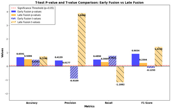 In order to determine and further validate the superiority of the Late Fusion model over the Early Fusion model, a paired t-test statistical analysis was conducted on the main evaluation scores, as shown in Table 4. This provides a better insight into the model’s strengths and weaknesses and sheds light on its observed performance.