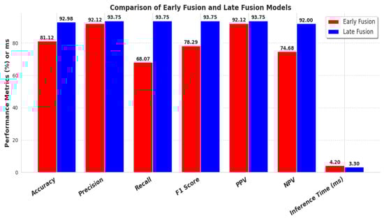 The results shown in Figure 5 indicate that there are no statistically significant differences in the two models, apart from precision, which suggests that Early Fusion outperforms the Late Fusion model. Late Fusion shows better overall performance in metrics; however, this could also indicate that the higher scores could stem from random sampling variations. The two models show no statistical significance; therefore, other factors should be taken into consideration, such as computational cost and robustness. To further test this, the Inference Speed Performance test was performed. The degrees of freedom (df) for each test were calculated as n − 1, where n = 10 test runs (df = 9). A 95% confidence interval (CI) was computed for the mean difference between the Early Fusion and Late Fusion models on each metric.