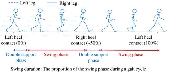 As shown in Figure 3, swing duration is the proportion of the gait cycle that accounts for the swing phase. The gait cycle presents the normalization of two successive steps. In this study, it starts (0%) and ends (100%) at the moments of left heel contact.