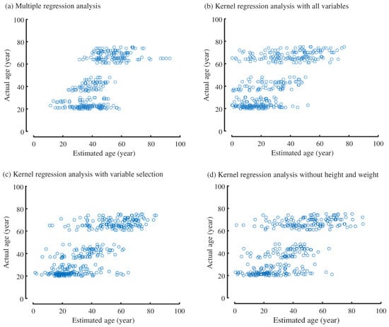 Herein, we compare the results of the estimation obtained from four models: (1) multiple linear-regression model using a step-wise variable selection method, (2) a kernell regression model using all explanatory variables, (3) kernell regression model established after variable selection, and (4) kernell regression model established after variable selection without self-declared height and weight. The multiple linear-regression model was computed using the stepwise function of MATLAB (2022b, MathWorks Inc., Natick, MA, USA). Training and testing for these models was conducted using five-fold cross validation. The age of each sample was estimated by the model trained on the dataset excluding itself. Table 2 summarizes the correlation coefficients and mean absolute errors of estimation for the four types of models. Mean absolute error was also used in earlier studies to evaluate the accuracy of age estimation [,,,].