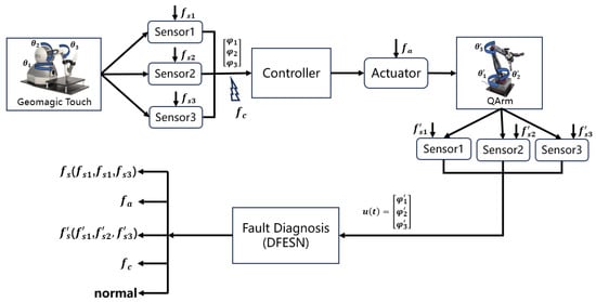 In recent years, remote-controlled robotic arms have been widely used in industrial production, hazardous environment detection, medical surgery, and other fields [1,2,3]. It can replace manual labor to complete complex and dangerous operation tasks, which greatly improves work efficiency and safety. However, due to the complexity and variability of the teleoperation environment [4,5], the high degree of coupling and the nonlinearity of the robotic arm system [6], and the long history of continuous work, the teleoperated robotic arm has a high incidence of failures in actual operation [7], which seriously affects its reliability and work performance. The reliability of the remote-controlled robotic arm system depends on the performance of each robotic arm and its communication quality [8]. Failure of a single arm can degrade the performance of its neighboring arms through communication, thus threatening the whole arm system [9]. Therefore, there is an urgent need for a method that can detect and diagnose abnormalities in teleoperated robotic arm systems at the initial stage of failure. Efficient and accurate fault diagnosis techniques [10] can not only buy valuable time for fault handling but also significantly reduce the system maintenance cost [11], reduce the risk of serious accidents leading to the paralysis of the whole system [12], and thus effectively guarantee the stable operation of the system and improve its reliability [13]. In this paper, we follow the terminology and methodologies outlined by Isermann and Ballé in their seminal work on model-based fault detection and diagnosis [14].