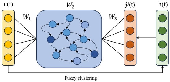 The fuzzy ESN structure is shown in Figure 2. The architecture of the Fuzzy-ESN consists of three parts: the input layer, the reservoir layer, and the output layer. The original data undergo processing in the reservoir layer to extract its intrinsic distribution characteristics. The reservoir layer serves as a fixed, large-scale recurrent neural network that transforms the input data into a high-dimensional dynamic state space, capturing complex temporal patterns for subsequent analysis. In an ESN, the weights of the reservoir layer play a crucial role in determining the network dynamic behavior and its ability to capture and process temporal patterns in the input data, as follows: