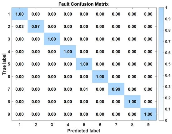 The confusion matrix presented in Figure 6 provides a detailed evaluation of the DFESN model’s performance in fault classification across different fault types for the leader–follower robotic arm system. Each coordinate from 1 to 9 represents a distinct fault type as described in Table 3, including normal operation, communication faults, actuator faults, and different sensor faults. The DFESN model exhibits a high classification accuracy for most of the fault types, achieving a perfect accuracy of 1.00 for fault types 1, 3, 4, 5, 6, 8, and 9. This indicates that these faults were correctly identified without any misclassification, highlighting the model’s robustness in diagnosing these particular types of faults. Notably, the perfect classification for sensor faults (types 4, 5, 6, 8, and 9) shows that the model can effectively handle fault detection that involves complex sensor data.