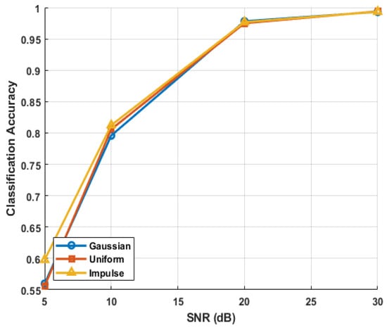 Classification accuracy of DFESN under different types of noise (Gaussian, Uniform, and Impulse) across various SNR levels.