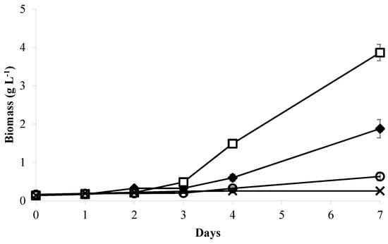 Biomass production of C. zofingiensis cultivated in various concentrations of whey wastewater (WW) compared to BBM medium. –◆– BBM medium; –□– 10% WW; –O– 20% WW; –×– 50% WW.