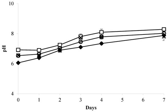 pH assessment during the culture of C. zofingiensis cultivated in various concentrations of whey wastewater (WW) compared to BBM medium. –◆– BBM medium; –□– 10% WW; –O– 20% WW; –×– 50% WW.