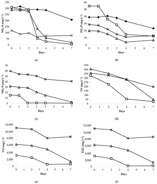 Nutrient uptake from whey wastewater diluted in BBM medium by Chromochloris zofingiensis: (a) Nitrate removal efficiency; (b) Phosphate removal efficiency; (c) Ammonia removal efficiency; (d) TN removal efficiency; (e) TC removal efficiency; (f) TOC removal efficiency. –◆– BBM medium; –□– 10% WW; –△– 20% WW; –×– 50% WW.