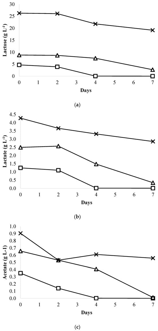 Lactose, lactate, and acetate uptake from whey wastewater diluted in BBM medium by Chromochloris zofingiensis: (a) Lactose removal efficiency; (b) Lactate removal efficiency; (c) Acetate removal efficiency. –□– 10% WW; –△– 20% WW; –×– 50% WW.