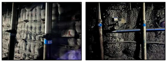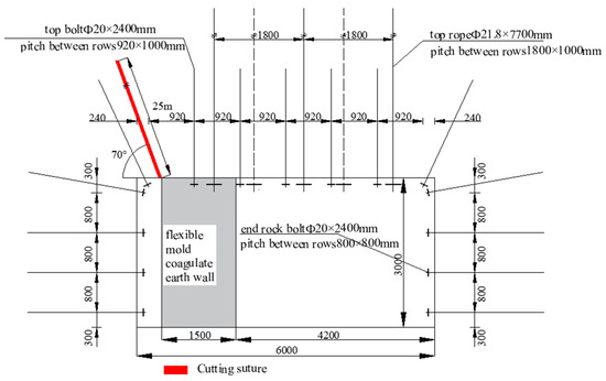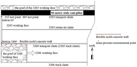 In the mining of 3206 working face, the field industrial test is carried out by using the technology of roof cutting and unloading of flexible concrete wall. Figure 10 shows the top cutting and support scheme. According to the geological conditions of the roof of 3206 face, the key parameters of pre-cracking and top cutting are as follows: The seam cutting hole is 300 mm away from the stopping side, and a row is arranged parallel to the top plate of the 3206 transport groove. The spacing is 2000 mm, the diameter of the seam hole is 60 mm, the depth is 25 m, the charging length is 14 m, the mud sealing is 11 m, and the angle between the seam hole and the plumb line is 20° (inclined to the side of the goaf). After the slit hole is completed, a 1.5 m width C30 flexible form concrete wall is built on one side of the goaf of the roadway, and the technology of retaining roadway along the goaf is implemented.