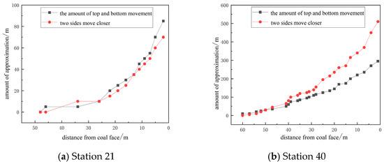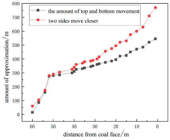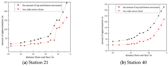 Figure 13 and Figure 14 show the surface position-shift curves of 3203 track channeling and transport channeling at measuring points No. 21 and No. 40, respectively. As can be seen from the figure, the deformation of the surrounding rock of the roadway increases slowly at first and then rapidly as the working face approaches the roadway. By analyzing the monitoring results of all stations, it can be concluded that the total deformation law of the channeling at the side of the lane-retention side is as follows: during the observation period, the displacement of the top and floor is about 85~400 mm, with an average of 264 mm, and the displacement of the floor is about 80%. The proximity between the two sides is about 70~545 mm, with an average of 328 mm. The total deformation law of the longitudinal trough at the side of the wide coal pillar is as follows: during the observation period, the displacement of the top and bottom is about 160~250 mm, with an average of 240 mm, and the displacement of the bottom is about 80%. The proximity between the two sides is about 20~220 mm, with an average of 141 mm. A large number of scholars have analyzed and concluded that the deformation of goaf roadway under the same geological conditions is much greater than that of roadway with wide coal pillar. Through the analysis of the top and floor displacement of the two longitudinal trays, it can be seen that the deformation control effect of track longitudinal trays on the side of flexible-mold concrete wall is close to that of transport longitudinal trays on the side of 50 m wide coal pillar after top cutting and pressure relief, and the deformation control effect of both sides is relatively obvious. By comparing the displacement convergence of the gob-side entry without roof cutting (as shown in Figure 2) with that after roof cutting, it can be seen that the average convergence of the two sidewalls decreased by 24.0% after roof cutting, and the average convergence of the roof and floor decreased by 27.0%. Combined with the previous numerical simulation results, roof cutting effectively reduces the deformation and failure of the surrounding rock on the gob-side-entry roadway.