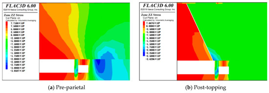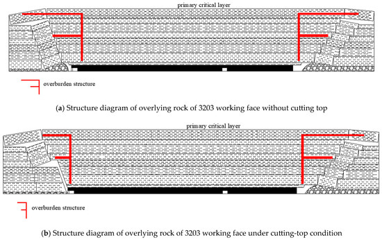 By using top cutting and pressure-relief technology to manually intervene in the fracture position of the basic roof, the roof of the goaf collapses along the cutting line, shortening the length of the roof cantilever beam and reducing the pressure on the coal pillar from the overlying rock cantilever beam structure, thereby reducing the lateral solid surrounding rock stress on the goaf and ensuring the stability of the surrounding rock when reusing the roadway [22]. Figure 4a and Figure 4b respectively show the overlying rock structure before and after the top cutting of the 3203 working face. As shown in the figure, under the condition of no top cutting, the boundary structure of the overlying rock on both sides of the isolated working face is F-shaped [23,24]. Due to the asymmetry of the 50 m wide coal pillar and 1.5 m flexible formwork concrete wall left on both sides of the 3203 isolated working face, the length of the cantilever beam on one side of the wide coal pillar is longer, but the area of the wide coal pillar is much larger than that of the flexible formwork concrete wall. Therefore, the load per unit area borne by the flexible formwork concrete wall is greater than that on the side of the wide coal pillar. Under the cutting-top condition, the cantilever beam on the flexible formwork concrete-wall side fractured along the pre-splitting line, greatly reducing the length of the cantilever beam on the flexible formwork concrete-wall side. The boundary structure of the overlying rock on the cutting top-line side changed from a large F-shaped structure to a small F-shaped structure, reducing the load on the flexible formwork concrete wall and the lateral rock stress on the roadway under the same support width condition.