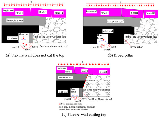 Figure 5a, Figure 5b, and Figure 5c respectively show the principle of floor heave deformation and failure of the roadway supported by uncut flexible-form concrete wall, wide coal pillar-side roadway, and the roadway supported by cut flexible-form concrete wall [25,26]. It can be seen from the figure that under the action of lateral abutment pressure in the gob, the overlying rock pressure acts on the floor of the roadway through the stress-transfer path composed of zones I, II, and III. When the maximum load transmitted to the bottom drum-influence zone exceeds the limit load of the floor rock mass, the plastic deformation of the floor surrounding rock and the floor heave phenomenon will be caused. The failure depth of the plastic zone of the floor of the roadway supported by the flexible-form concrete wall without cutting the top is greater than that of the roadway supported by the wide coal pillar. This is because the static load pressure generated by the cantilevered beams of different lengths at the side of the goaf is transferred to the floor through different supporting systems, such as the wide coal pillar or the flexible-form concrete wall after the mining of the previous working face. The load per unit area of the flexible-form concrete wall is greater than that of the wide coal-pillar side. This difference in stress distribution results in the lower load on the floor heave area of the wide coal-pillar side than that of the flexible concrete-wall side, and the plastic failure depth of the flexible concrete-wall side is greater than that of the wide coal-pillar side, so the floor heave volume of the mining roadway on the flexible concrete-wall side is greater. In order to solve the serious problem of roadway floor heave, the surrounding rock control technology of cutting the top and relieving pressure was proposed. The implementation of the cutting process effectively changed the mechanical transfer mechanism: The length of the equivalent cantilever beam on the side of the flexible-form wall decreases after the top cutting, and this stress redistribution effect significantly improves the stress state of the floor rock mass and reduces the load affected by the floor heave zone and the depth of the plastic failure zone of the floor, which well controls the floor heave deformation and failure.