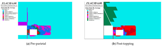 Figure 7a and Figure 7b respectively show the cloud image of the plastic zone of surrounding rock of the retaining roadway 10 m ahead before and after the top cutting. It can be seen from the figure that the damage of the plastic zone of the roof near the cutting seam of the roadway is significantly reduced after the top cutting, and the plastic zone area of the roadway floor before the top cutting is 2.5 m2. The area of plastic zone after top cutting is 1.3 m2. Compared with the condition of leaving the roadway without cutting the roof, the damage of the plastic zone of the roadway roof near the cutting seam is significantly reduced, and the plastic zone area of the floor is reduced by 1.2 m2 (48.0%). After cutting the top, the depth of the plastic zone of the solid coal wall is reduced by 1.2 m (18.8%), and the control effect of surrounding rock is remarkable.