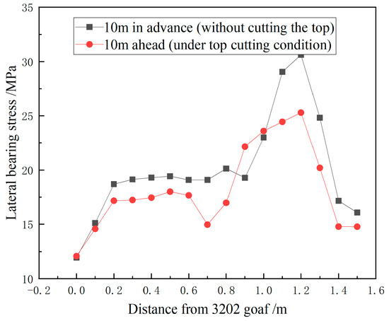 Figure 8 and Figure 9 respectively show the lateral supporting stress cloud map and the lateral supporting stress distribution curve of the flexographic concrete wall before and after the top cutting at 10 m of the advance working face. As can be seen from the figure, when the top is not cut, the vertical stress of the flexible form concrete wall is 11.9~30.6 MPa, with an average of 20.6 MPa. The peak stress is located 1.2 m away from the goaf 3206, and the peak vertical stress is 30.6 MPa. After cutting the top, the vertical stress of the flexural concrete wall ranges from 12.1 to 25.3 MPa, with an average of 18.2 MPa. The peak stress is located 1.2 m away from the goaf 3202, and the peak vertical stress is 25.3 MPa. The average vertical stress of the flexible form concrete wall is reduced by 2.4 MPa (11.7%) compared with that of the wall without cutting the roof. The peak stress is reduced by 5.3 MPa (17.3%). It can be seen that the cutting of the top has an obvious effect on the side pressure relief of the flexural concrete wall.