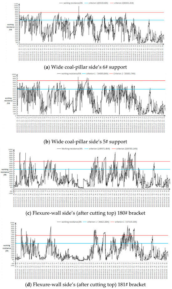 Figure 11 shows the working resistance distribution curve of the hydraulic support at the side of some wide coal pillar and the end of the roadway after cutting the top. As can be seen from the figure, the average resistance of 1# to 6# end hydraulic support is 2635~4455 kN (1# to 6# support is located on the side of the wide coal pillar), and the average resistance of 180# to 185# end hydraulic support is 1403~4356 kN (180# to 185# support is located on the side of the flexible concrete wall). Compared with the wide coal-pillar side, the average working resistance of the hydraulic support at the end of the roadway side after cutting the top is reduced by 992 kN. It is generally believed that the load on the roadway retaining side without cutting the top is greater than that on the wide coal-pillar side [27,28], and the load on the roadway retaining side after cutting the top is lower than that on the wide coal-pillar side through the working resistance analysis of the hydraulic support at the end, so the cutting effect is good.