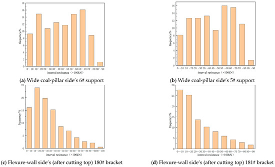 - Compared to the wide coal pillar side, the face-end hydraulic supports on the pillarless gob-side entry retaining side after roof cutting exhibit distinct differences in the distribution patterns and magnitudes of working resistance. As the interval resistance increases, the average working resistance of hydraulic supports on the wide coal pillar side demonstrates uniform distribution, ranging from 2635 to 4455 kN. In contrast, the pillarless side post-cutting shows a declining trend in the frequency distribution of average working resistance, with values ranging from 1403 to 4356 kN, resulting in an average reduction of 30% compared to the non-cutting scenario.