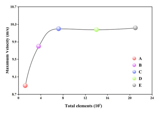 | Mesh Type | Total Elements | Maximum Velocity/m s−1 |