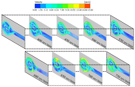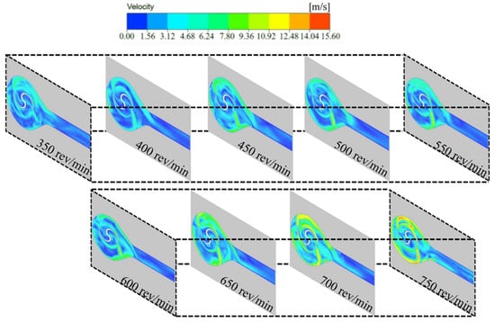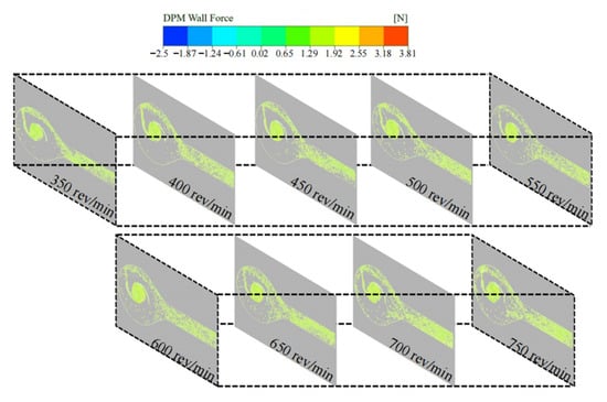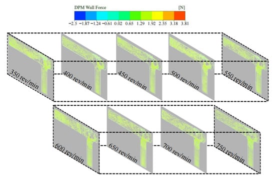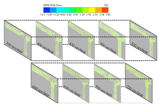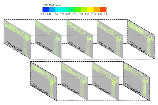 - The simulation study demonstrated that when the centrifuge rotation speed was within the range of 550–600 rev/min, the collision between the krill body and the pumping machine wall, as well as the krill body itself, was significantly reduced. This result indicated that this condition resulted in the lowest damage rate. Within this specific range of rotation speeds, the growth rate of the velocity gradient in the centrifugal region exhibits a minimum at each working condition, particularly at 550 rev/min. Additionally, the increase in the particle collision force on the krill body with an increasing rotation speed is marginal, suggesting that this range can effectively balance centrifugal separation efficiency and mechanical damage control.