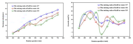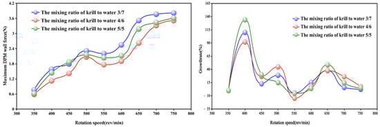 - The mixing ratio of krill–water is 4:6, and the centrifuge flow characteristics and krill density are selected to reach the optimal match. This process ensures that the krill body is minimised by the particle collision force and internal extrusion pressure. In this scenario, the propulsion exerted by the water flow on the krill body is found to be less significant than in the 3/7 condition. This, in turn, results in a decrease in the frequency of collisions between the krill body and the inner wall surface of the pumping apparatus. Moreover, in contrast to the 5/5 condition, the decline in krill body density serves to reduce extrusion stress between the groups, thereby conferring a dual benefit in the form of damage inhibition.