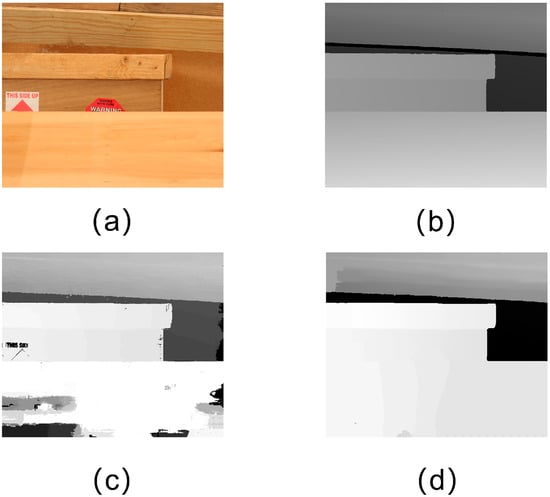 Wood: (a) left image; (b) standard disparity; (c) disparity of stereo matching by SGM; (d) disparity of stereo matching in this paper.