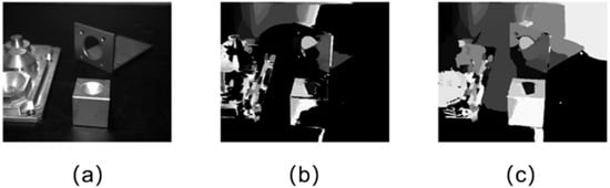 Mechanical parts: (a) left image; (b) disparity of stereo matching by SGM; (c) disparity of stereo matching in this paper.