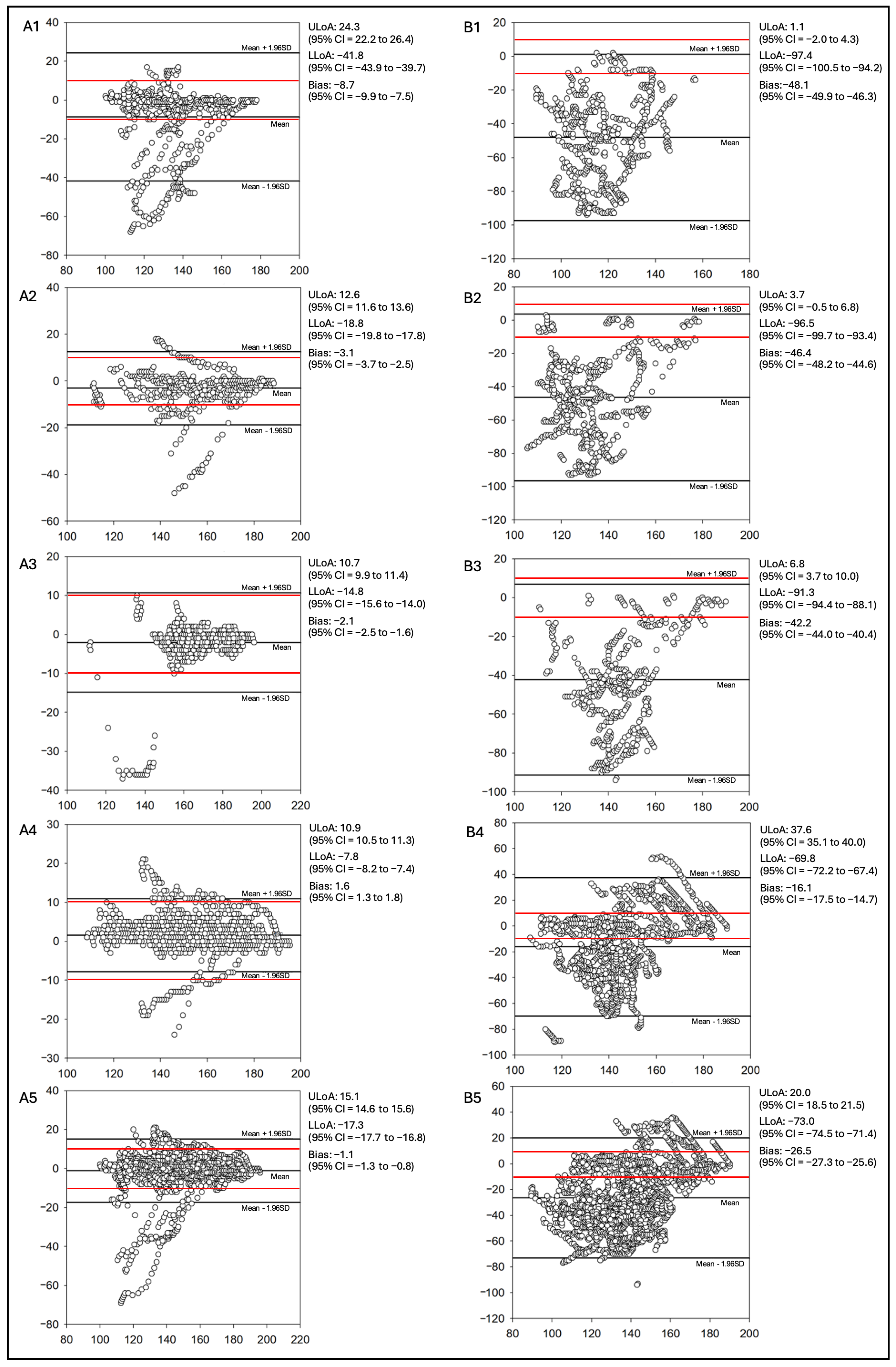 Figure 2(A5)) the mean bias is −1, which is very close to zero, but the computed LoA are still larger than 10 b·min