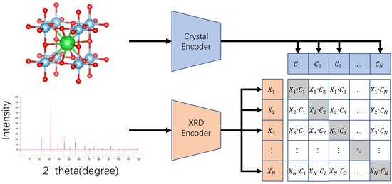 The main framework of this work model is a dual-encoder contrastive learning model. As illustrated in Figure 1, crystal structures are processed through a structure encoding tower based on SE(3)-equivariant graph neural networks, which are very commonly used in the current crystal machine learning frameworks [36,37,38,39], while pattern information is encoded using a simple one-dimensional convolution. The dual-tower structure maps the data from two modalities into the same space for contrastive learning modality fusion. The crystal structure illustrations in this work were provided by VESTA [40,41].