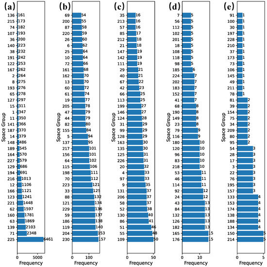 Histogram of the frequency distribution of different space groups in the dataset (the numbers behind the bars represent the frequency values in descending order from left to right and from bottom to top). The statistics of space groups are divided into five subfigures (a–e), with each subfigure containing values of similar magnitude.