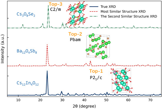 From the model’s inference results shown in Figure 3, the space group of the crystal structure corresponding to the detected XRD is (monoclinic, Bravais lattice type P). The space group of the Top-2 inferred structure is Pbam (orthorhombic, Bravais lattice type P), and the space group of the Top-3 inferred structure has extended to (monoclinic, Bravais lattice type C). Analyzing from the perspective of symmetry evolution, the model’s prediction ranking of , , and reveals a deep connection between the hierarchy of symmetry breaking and diffraction characteristics, despite the significant overlap of XRD patterns in specific angular ranges, as shown by the strong peak clusters. This symmetry-sensitive prediction mechanism may originate from E(3) invariance and strong local learning constraints in cluster expansion: (1) During data augmentation, by applying symmetry transformations allowed by specific space groups (such as glide plane reflections and screw axis translations) to atomic positions, the invariance constraint under symmetry operations forces the model to learn intrinsic symmetry features rather than being limited to specific atomic coordinate arrangements. For example, the screw axis operation of generates a periodic phase shift in the diffraction intensity distribution, and the model filters out such nonessential differences through an invariance Loss function. (2) Lattice symmetry components (related to Bravais types) and atomic primitive components (related to Wyckoff positions) are automatically learned and undergo distance relaxation during the aggregation of local representations (the essence of contrastive learning is to readjust the distances between samples), such as the significant separation of and in the lattice symmetry subspace (Bravais types are explicitly separated), but they are similar in the atomic primitive subspace. This differs fundamentally from traditional database queries, which typically rely on preset structural descriptors (such as space group numbers and cell parameter thresholds) or empirical peak position similarity (such as Euclidean distance), and cannot distinguish between symmetry breaking due to differences in Bravais lattice types (such as P→C) and pseudo-symmetry caused by atomic primitive perturbations. Additionally, the deep learning method also compensates for the lack of local–global feature coupling, as traditional methods usually handle lattice parameters and atomic positions independently, while deep models can achieve multiscale aggregation, establishing dynamic associations between local chemical environment features in cluster expansion and global symmetry features.