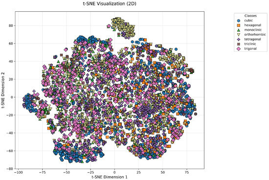 To further analyze the physical information learned by the model, t-SNE [46] was used to reduce the dimensionality and visualize the hidden layer of the model. From Figure 4, it can be seen that while some local clustering effects of crystal systems are retained during contrastive learning training, the overall clustering is not significantly constrained by crystal systems.