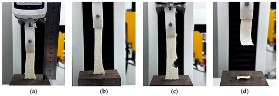 The MARK-10 ESM 1500S single-column tensile teste (Mark-10 Corporation, Copiague, NY, USA) was used for the biological tissue tensile tests. The fixture was clamped 15 mm from the upper and lower edges of the sample, with an initial distance of 60 mm between fixtures. A preload of 0.5 N was applied to eliminate the viscoelastic effects of the aortic wall. The tester was started, and the sample was stretched at 1.2 mm/min until complete rupture, as shown in Figure 2.