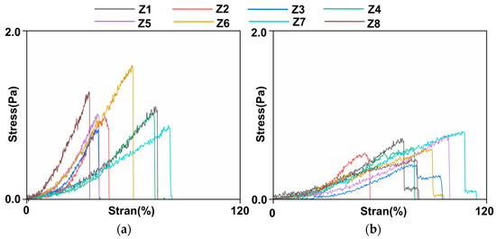 Uniaxial tensile tests were performed on the adventitia, media, intima, FL wall, and intimal flap to obtain stress–strain curves. This study focuses on the intimal flap group. Eight valid datasets were acquired in the circumferential and longitudinal directions. The results showed the material exhibited distinct linear and nonlinear elastic phases, with directional mechanical variations (Figure 3a,b), consistent with the anisotropic hyperelasticity of the aortic wall.