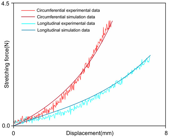A sample model was built in ABAQUS-ISIGHT with a length of 60 mm and a width of 10 mm. The HGO anisotropic hyperelastic material was selected, with a density of 1100 kg/m3. Initial parameter values were set based on Fischer [21]: C10 = 0.02918 MPa, k1 = 0.01037 MPa, k2 = 2.03, θ = 42.4°, and κ = 0. During the tensile simulation, one end of the sample was fixed, while the other was subjected to a velocity condition of 1.2 mm/min. Experimental data on the tensile force and displacement from circumferential and longitudinal tests were used to compare the experimental and simulation results. The least squares method was applied to fit the experimental data, followed by optimization using a multi-island genetic algorithm.