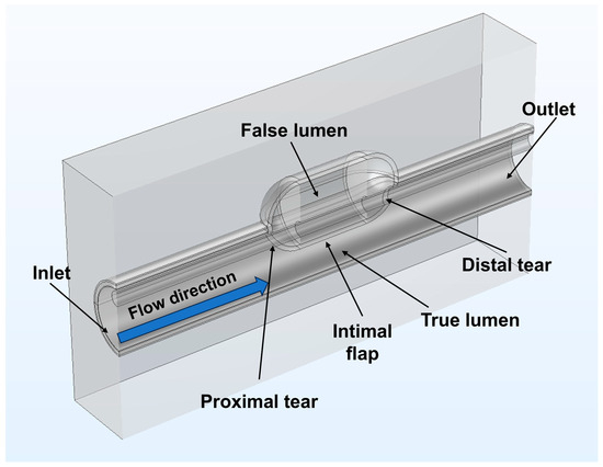 - Chong, M.Y.; Gu, B.; Chan, B.T.; Ong, Z.C.; Xu, X.Y.; Lim, E. Effect of intimal flap motion on flow in acute type B aortic dissection by using fluid-structure interaction. Int. J. Numer. Methods Biomed. Eng. 2020, 36, e3399. [Google Scholar] [CrossRef]