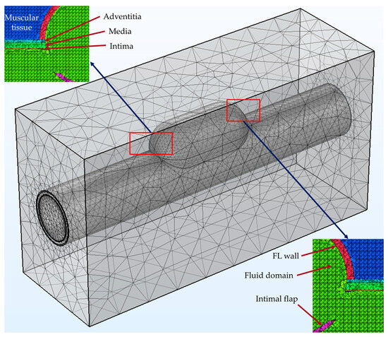 According to the material properties, the model was divided into seven parts: adventitia, media, intima, intimal flap, FL wall, muscular tissue, and fluid domain. Meshing of each part was performed using COMSOL Multiphysics 6.2.