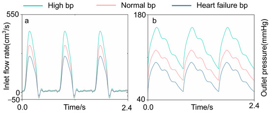 Based on clinical data [19], boundary conditions for the vessel inlet, outlet, and surrounding tissues were set. A flow rate boundary condition was applied at the inlet, with the flow waveform shown in Figure 8a. A pressure boundary condition was applied at the outlet, with the aortic outlet pressure pulsation waveforms set to three different conditions: hypertension (160/90 mmHg), normal pressure (120/70 mmHg), and heart failure pressure (100/50 mmHg), as shown in Figure 8b. The inlet and outlet settings at both ends of the vessel were fixed, while the vessel walls were allowed to move within the physiological range to simulate the elastic deformation of the vessel.