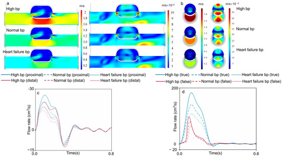 Figure 9c,d show the changes in blood flow through the proximal and distal tears and the true and FL middle cross-sections within a cardiac cycle. Under the three different blood pressures, the maximum blood flow through the proximal/distal tears is 25.6963/20.2142, 20.6344/16.8429, and 16.9391/14.1941, respectively. The maximum blood flow through the TL/FL transverse middle cross-sections is 183.0072/97.8707, 140.6227/80.7917, and 107.6888/65.2094, respectively. The unit of blood flow is cm3/s.