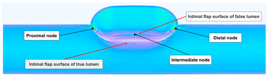 The data of three nodes of the intimal flap—the proximal node, the distal node, and the symmetric center of the inner membrane sheet on the transverse middle cross-section (intermediate node)—were analyzed, as shown in Figure 10.