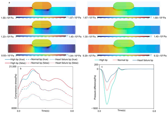 Figure 11b shows the average compressive stress waveform of the intimal flap on the transverse mid-section between the TL and FL during a cardiac cycle. Figure 11c reflects the changes in the mean compressive stress difference between the TL and FL. Under different bp conditions, the maximum compressive stress difference (TL value minus FL value) occurred at approximately 0.113 s, with values of −1608 Pa, −978 Pa, and −593 Pa, respectively. This indicates that bp changes significantly affect the compressive stress difference between the TL and FL. Higher bp increases this difference, with the FL experiencing greater compressive stress, leading to dissection extension and enlargement.